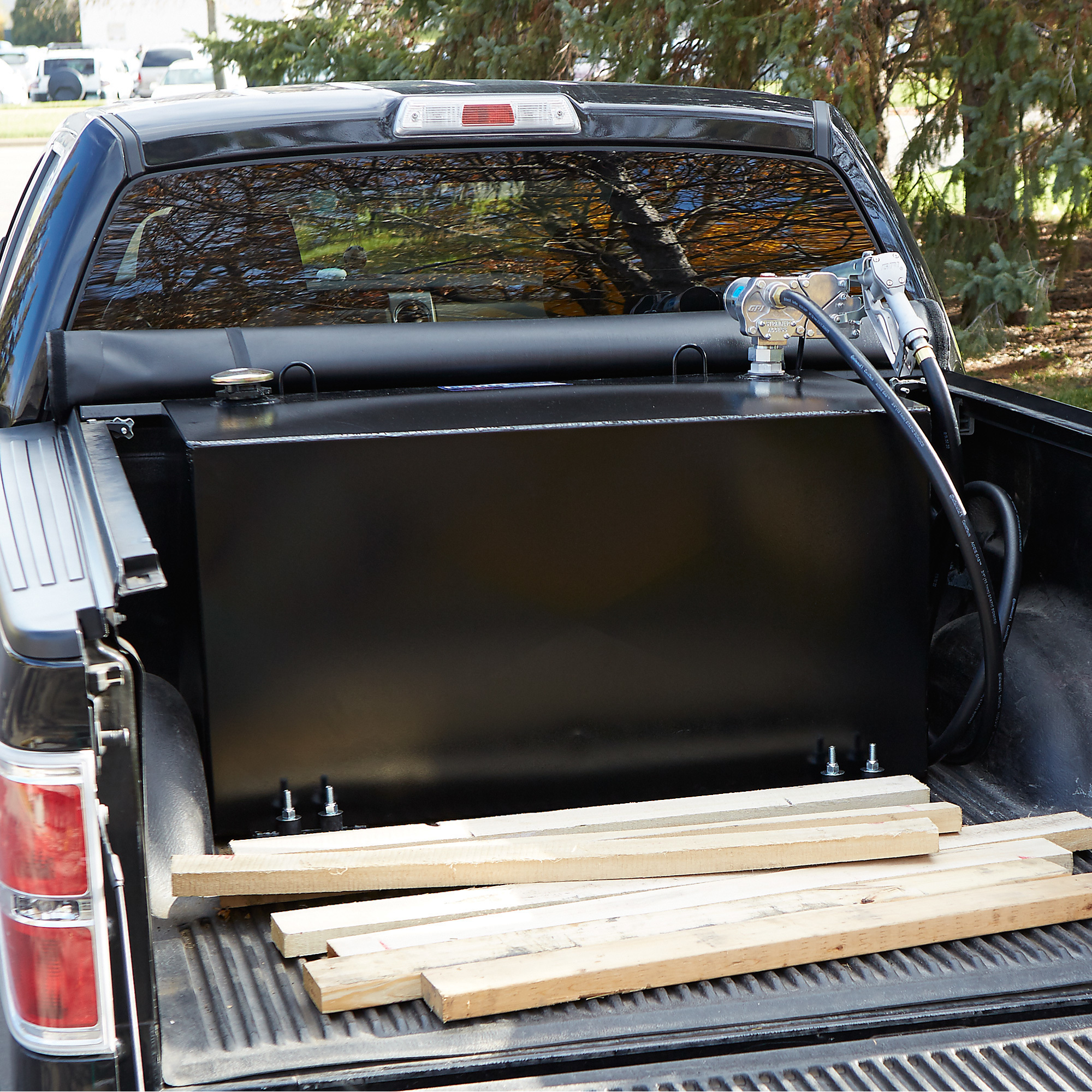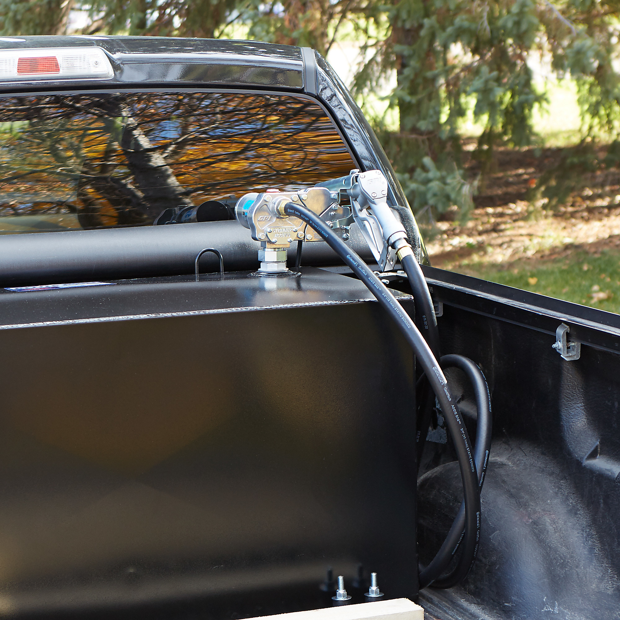 (1) 100-gallon black rectangular fuel tank with 12V DC, 15 GPM pump